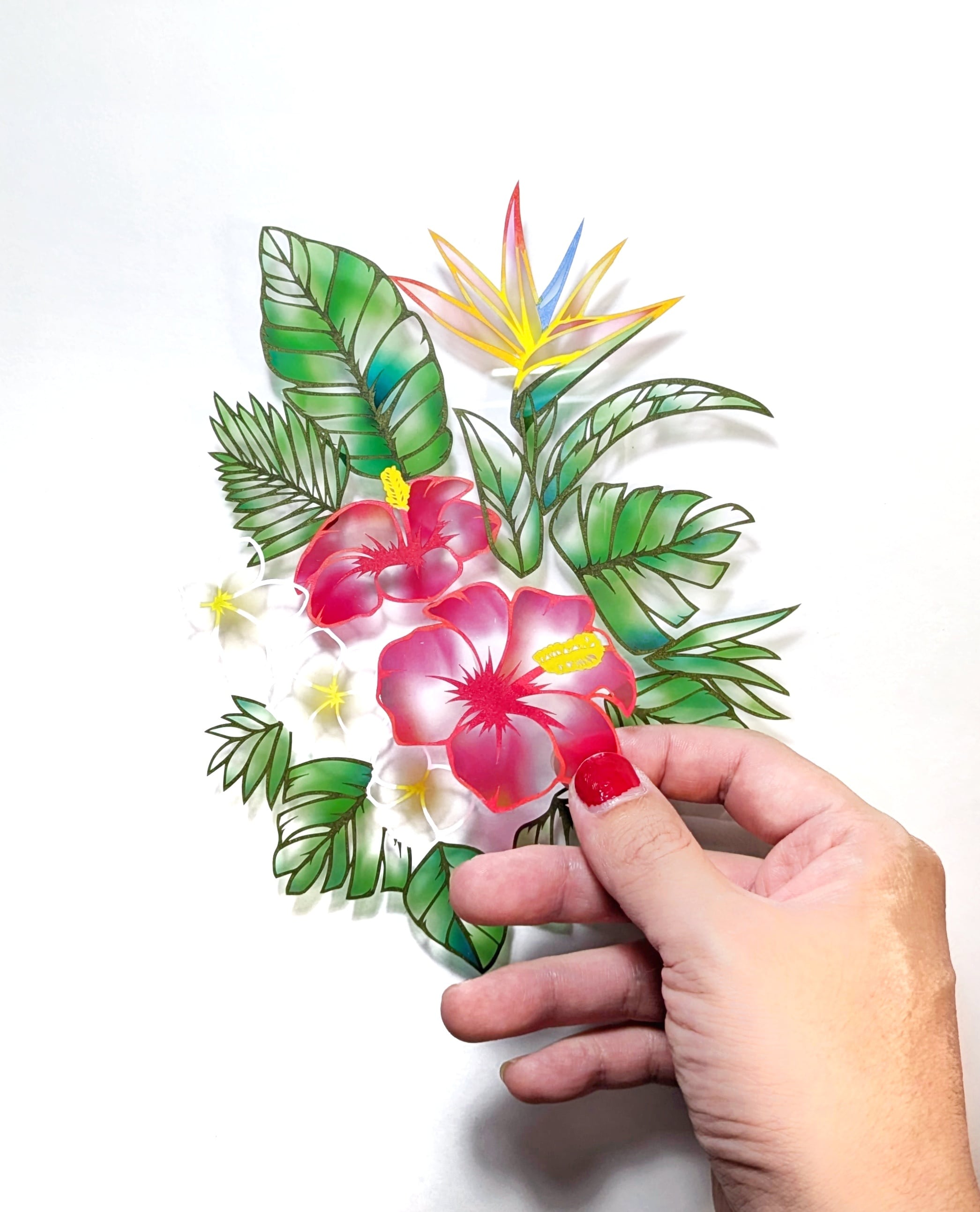 ハイビスカス、プルメリア、極楽鳥花など南国の切り絵で表現した作品です。
