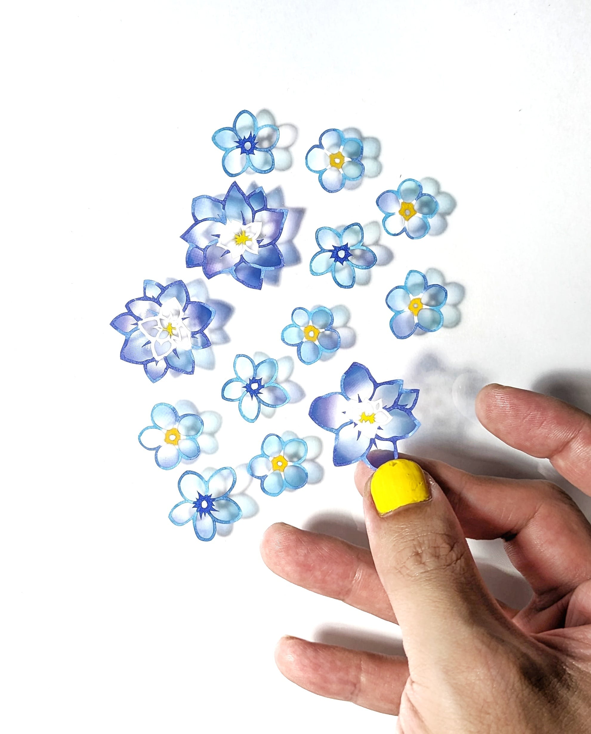 少し強めの青の額に添えられた金色のラインはワスレナグサの花の黄色とマッチしており、アクセントとして最適。