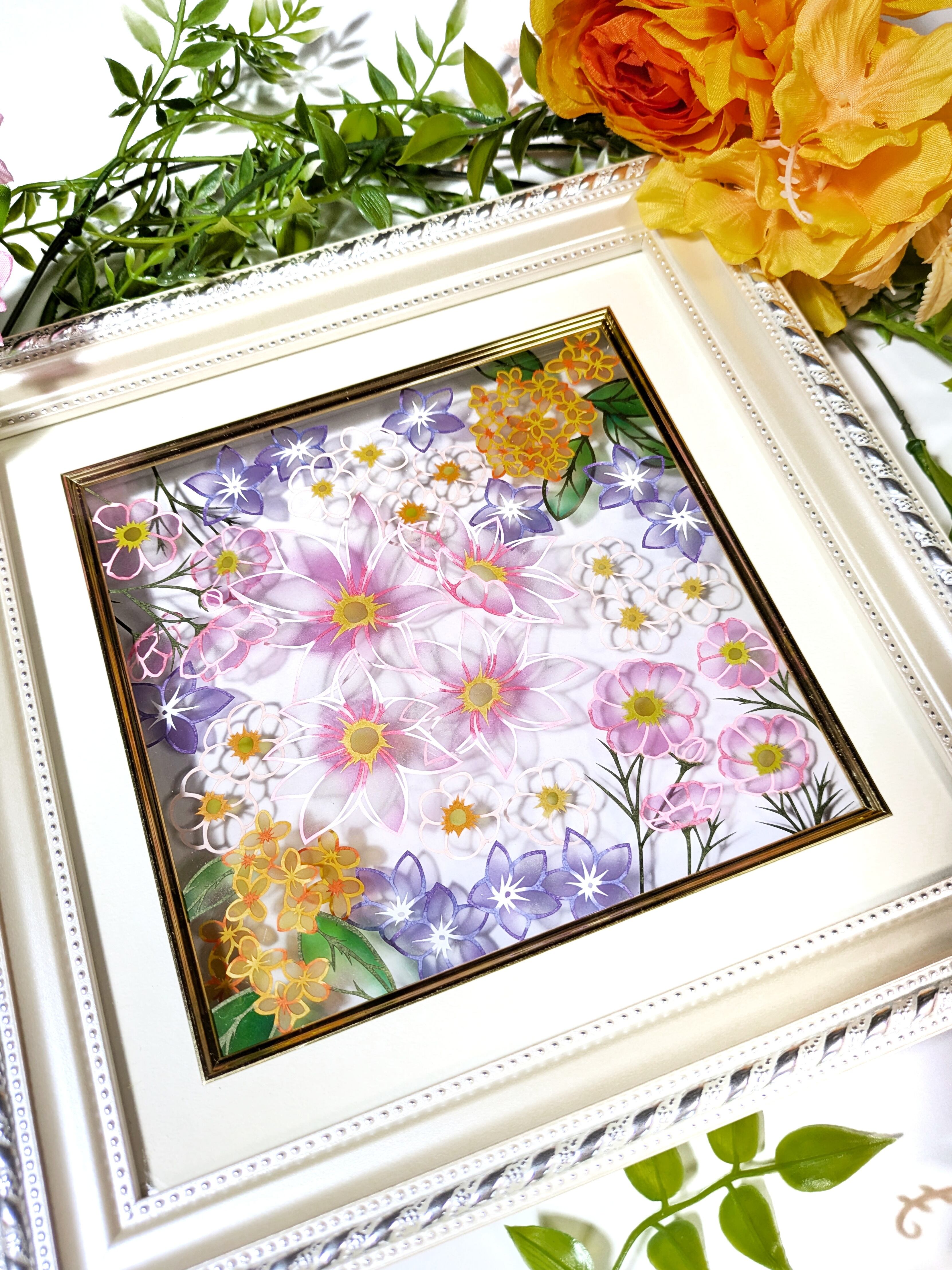 慎重に仕上げられた切り絵は、光の当たり具合や飾る角度によって、異なる表情を見せます。