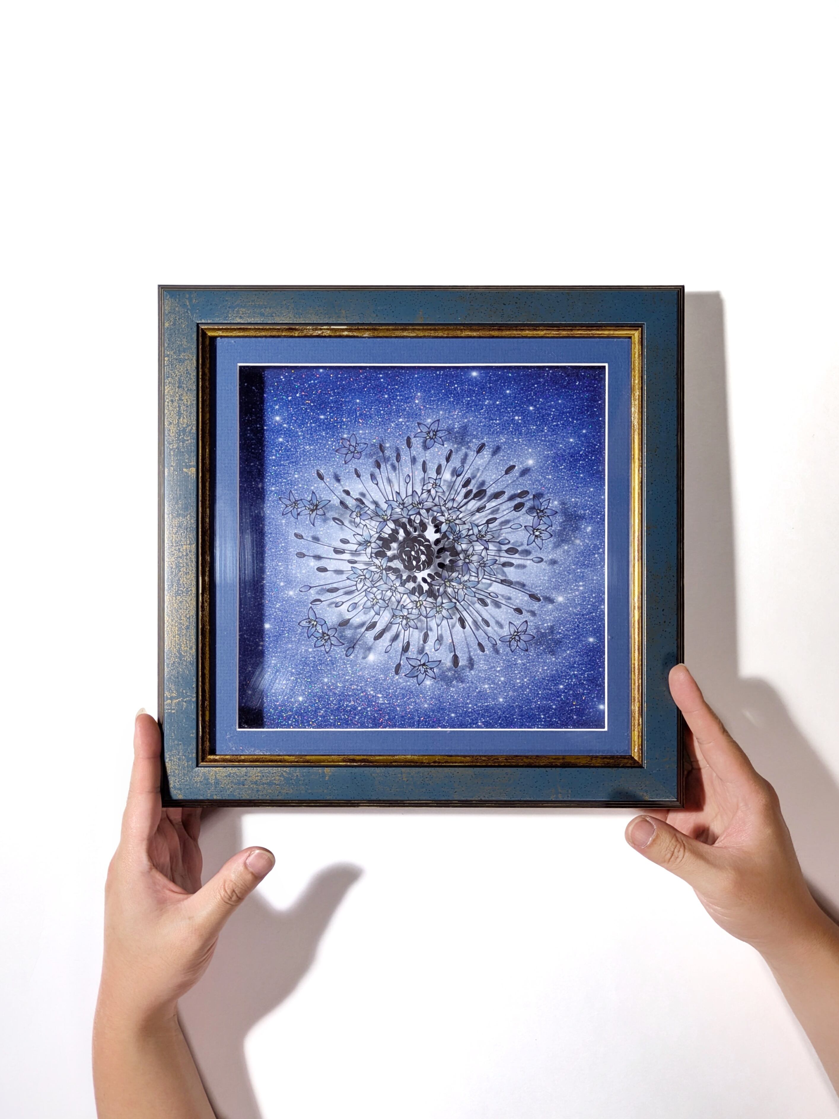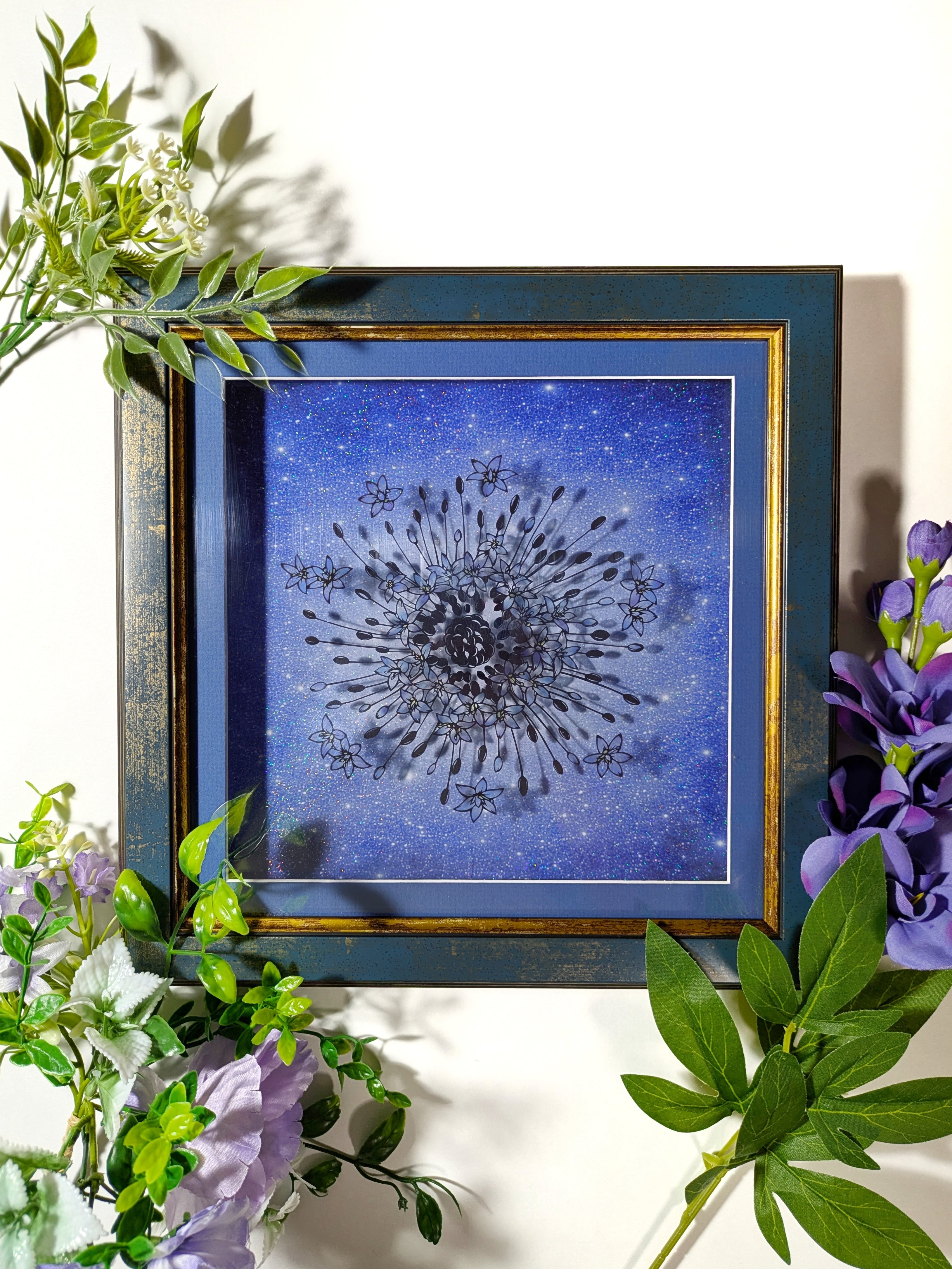 それぞれの小さな花の中に夜空の藍色ときらりと輝くめしべが小さな星空をも感じさせるような世界を創りました。