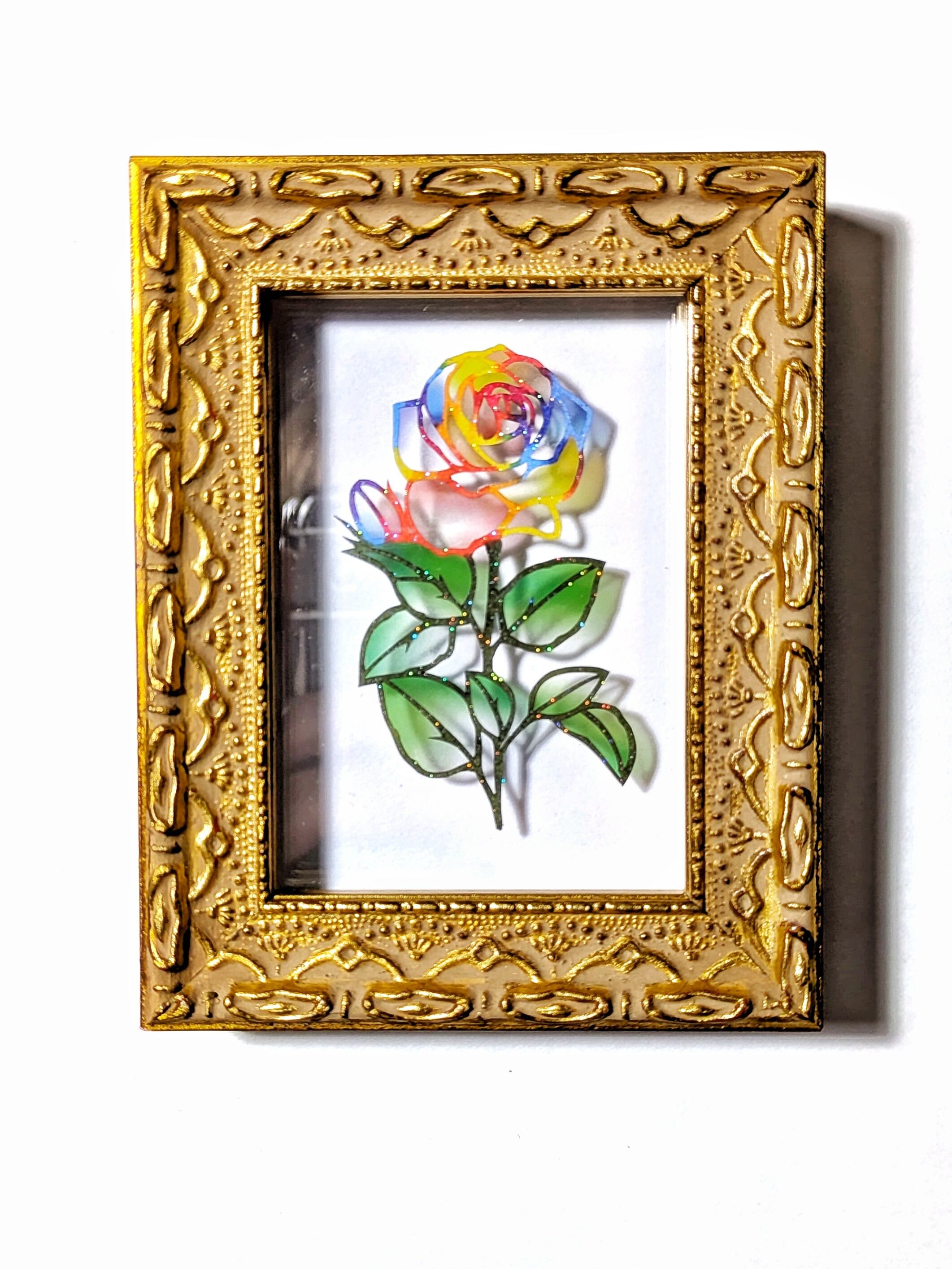 一つのバラがカラフルな虹色に輝く切り絵です。